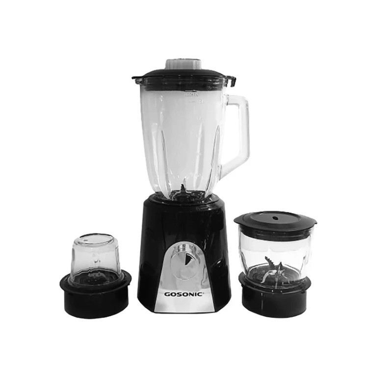 مخلوط کن سه کاره گوسونیک مدل GSB-709 با توان موتوری 500 وات یکی از جدید ترین محصولات تولید شده این شرکت می باشد. جنس بدنه این دستگاه از پلاستیک و پارچ مخلوط کن، از شیشه پیرکس بوده و دوام بالایی دارد. ظرفیت پارچ مخلوط کن آن 1.5 لیتر است. تیغه های مخلوط کن از جنس استیل ضدزنگ و چهارتایی هستند و دارای دو سرعت و عملکرد لحظه ای یا همان پالس(pulse) است. این تیغه ها قابلیت جدا سازی و شستشو دارد. پایه این دستگاه ضد لغزش بوده و نمی لغزد. تعداد تنظیمات سرعت این مخلوط کن شامل 2 سرعت می باشد . این مخلوط کن و آسیاب 3 کاره گوسونیک مدل GSB-709 دارای ابعاد 410 × 180 × 160 و وزنی برابر با 2.7 کیلو گرم می باشد و جنس تیغه های آن Steel ضد زنگ بوده که در برابر آب کیفیت خود را به راحتی از دست نمیدهد. در کنار این مخلوط کن یک خردکن برای خردکردن سبزیجاتی مانند پیاز و فلفل ، گوشت ، و حتی خشکبار را به راحتی میتوانید خرد کنید و یک آسیاب برای پودر کردن موادی چون پودر قند ، ادویه جات و قهوه میتوان از آن استفاده کرد.