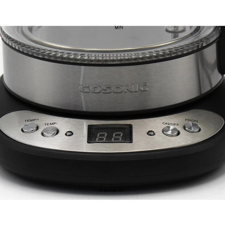 منو کنترلی این چای ساز گوسونیک GST-768 مجهز به یک صحفه نمایش دیجیتال به صورت فشاری است. مهم ترین مزیت چای ساز تعبیه کلید + و – Temperature برای تنظیم درجه دلخواه دستگاه به منظور گرم نگه داشتن آب درون کتری می باشد. دو دکمه دیگر که در سمت راست قرار دارد مربوط به خاموش روشن شدن و دکمه تنظیمات است. این منوی تنظیمات دارای یک نمایشگر آبی رنگ نیز می باشد.