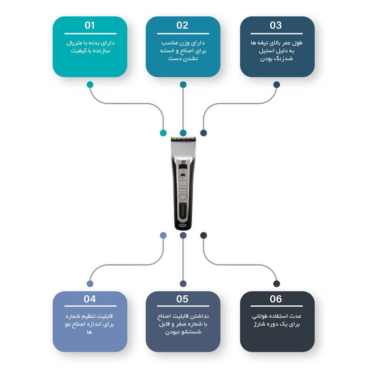 ماشین اصلاح پرومکس مدل «2226» دارای تیغهای از جنس استیل ضد زنگ با طول اصلاح 1 تا 1.9 میلیمتر بوده و با برق و باتری قابلاستفاده است. تیغهی این ماشین اصلاح از استیل ضدزنگ ساخته شده و برای اصلاح موهای سر مناسب است. طول اصلاح این تیغه را میتوان به کمک اهرم کنار دستگاه تغییر داد. البته برای اصلاح موها در اندازههای بیشتر 2 عدد شانهی اصلاح نیز ارائه شده است. طول اصلاح این شانهها 6-3 و 12-9 میلیمتر است. ماشین اصلاح پرومکس به باتری قابل شارژ مجهز شده است تا بتوان به شکل بیسیم از آن استفاده کرد. البته خوشبختانه در صورت تمام شدن شارژ باتری میتوان با اتصال دستگاه به برق نیز کار اصلاح را انجام داد. برای این محصول نشانگر LED هم در نظر گرفته شده که میتوان از آن برای آگاهی از میزان شارژ باقیمانده دستگاه استفاده کرد. برای اینکه تیغهی ماشین اصلاح همیشه در بهترین شرایط کارکرد قرار داشته باشد، پس از هر بار اصلاح باید خردههای مو را توسط برس مویی ارائه شده تمیز کرد. برای افزایش عمر تیغه باید مرتباً آن را روغنکاری کرد. برس مویی و روغن داخل جعبه وجود دارند. بهطورخلاصه ماشین اصلاح پرومکس مدل 2226 دارای تیغهی استیل ضدزنگ ، طول اصلاح قابل تنظیم از 1 تا 1.9 میلیمتر، 2 شانهی اصلاح از 6-3 و 12-9 میلیمتر و باتری قابل شارژ بوده و با برق و باتری میتوان از آن استفاده کرد.