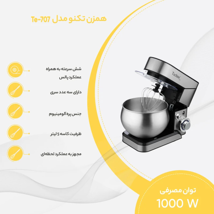 همزنهای برقی ازجمله وسایل کاربردی خانه هستند که معمولاً در دو نوع پایهدار و بدون پایه تولید میشوند. همزن مدل « Te-707» یکی از محصولات کاربردی ساخت برند «تکنو» است که از نوع همزنهای پایهدار است. این مدل مانند دیگر محصولات برند تکنو، از طراحی ساده و ارگونومیک برخوردار است و با یک کاسه استیل همراه شده است. جنس بدنەی آن از پلاستیک فشرده مقاوم با توان موتور 1000 وات فوقالعاده قوی و بادوام را داراست. این همزن دارای قابلیت تنظیم سرعت است و به شما این امکان را میدهد تا سرعت این مدل را در 6 حالت تنظیم کنید. ظرفیت این محصول نیز مناسب است. همزن Te-707 با سه سری مخصوص ارائه شده است که علاوهبر همزدن یا میکسکردن، از قابلیت خمیرزنی و همچنین ورز دهنده نیز برخوردار است، تا دست آشپز را در تهیه و پخت غذاهای مختلف باز نگه دارد. کاسه استیل ضدزنگ دستگاه کاملا در محل خود قفل می شود و حین کار دستگاه هیچ لرزشی احساس نمی شود و پس از اتمام کار، کاسه بازشده و قابل شستشوی دستی و ماشینی است.