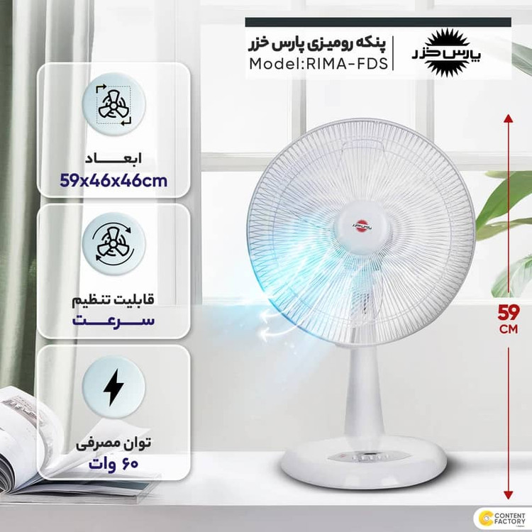 پنکه رومیزی پارسخزر مدل RIMA در گروه پنکههای پایهدار و رومیزی عرضه شده است. این محصول ظاهری زیبا داشته و کارآیی بالایی دارد. توان بالای موتور باعث راندمان کاری بالای دستگاه شده است. این پنکه دارای کلید تنظیم سرعت در سه حالت بهصورت لمسی با نشانگر LED است. حجم باددهی بالای دستگاه باعث میشود تا هوا در فضای بزرگی بهجریان درآید. این مدل دارای گارد محافظ میلهای است تا از برخورد احتمالی با پرهها جلوگیری شود و خطری برای کسی ایجاد نشود. این محصول دارای قابلیت تنظیم آسان زاویه وزش باد بهصورت جغجغهای است. حالت ریتم جهت دستیابی به وزش باد ملایم در نظر گرفته شده است که یکی از ویژگیهای این محصول است. طراحی دستگاه طوری است که ایستایی خوبی داشته و پایه طراحی شده برای آن مانع از افتادن در اثر برخورد یا تکانهای کوچک میشود.