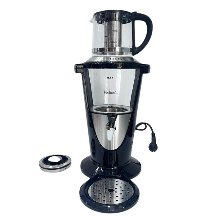 به دلیل محبوبیت چای در بین ایرانیان، وجود چای ساز در هر خانه ای کاربردی است. چای ساز کمک می کند تا در کم ترین زمان ممکن چای یا دمنوش دلخواه خود را دم کنید. جنس بدنه چای ساز، یکی از عوامل مهم و تاثیر گذار روی طعم چای است زیرا اگر چایی ساز شما متریال خوبی نداشته باشد، طعم نامطلوبی به چای خواهد داد. چای ساز های موجود در بازار در انواع شیشه ای، پلاستیکی و استیل موجود می باشند. چای ساز ها دارای انواع متنوعی از جمله چای ساز سرهمی، چای ساز کنارهمی و چای ساز سماوری می باشند. چای ساز های سماوری به دلیل اینکه قوری در بالای کتری قرار می گیرد، بخار آب حاصل از کتری به سمت قوری رفته و چای به آرامی دم میکشد که باعث خوش رنگ و خوش عطر شدن چای می شود. چای ساز تکنو مدل TE-918 یکی از چای ساز های با کیفیت و خوش ساخت از برند تکنو است که از نوع چای ساز های سماوری بوده و بدنه آن از جنس شیشه (glass)، استیل و پلاستیک می باشد. این محصول دارای قوری با ظرفیت 1 لیتر و کتری با ظرفیت 3 لیتر است.